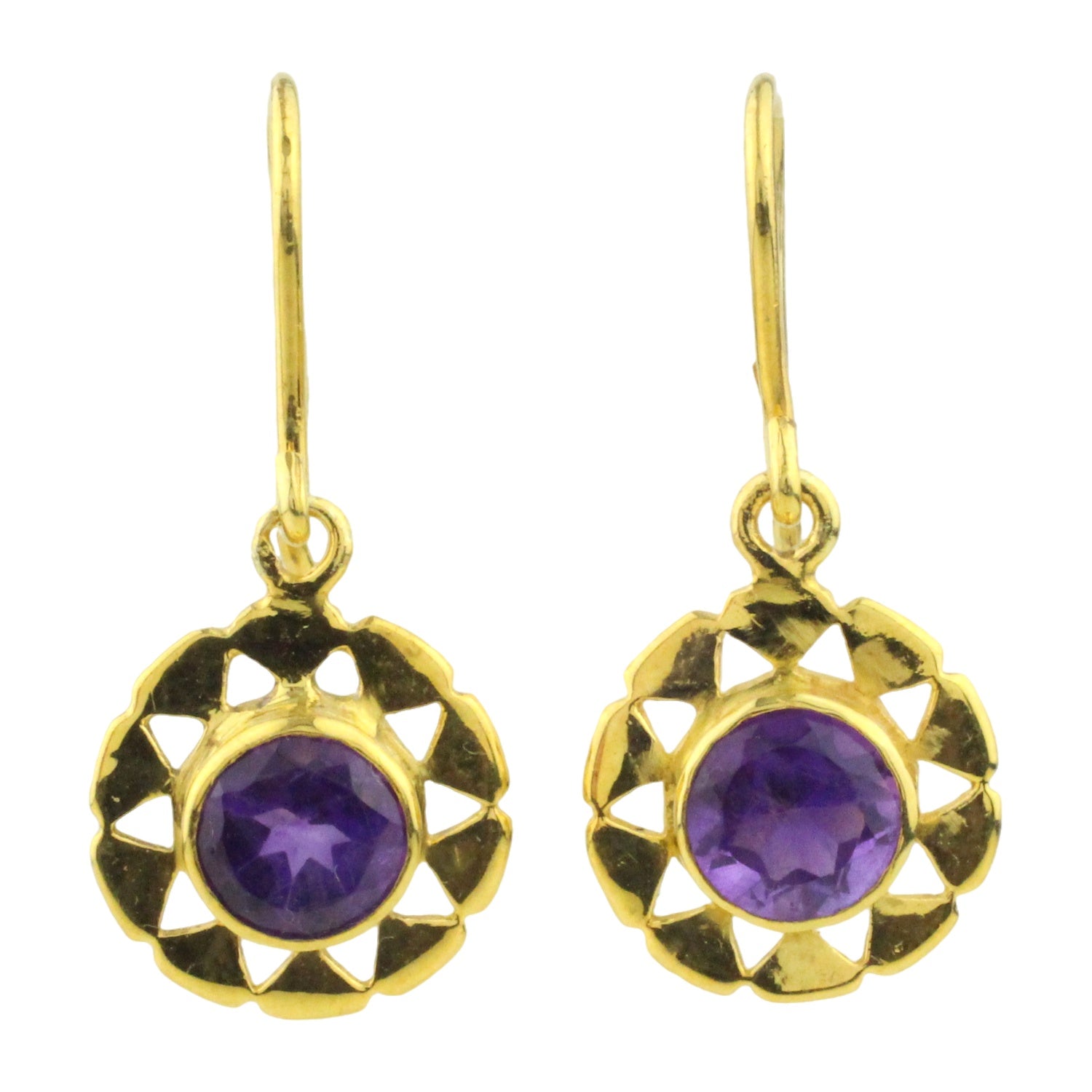 Dessa handgjorda örhängen i äkta sterlingsilver (925), omsorgsfullt förgyllda med 22 karats guld, utstrålar en tidlös elegans med sin harmoniska design och levande färgprakt. Varje örhänge pryds av en rund, fasettslipad naturlig ametist – en ädelsten känd för sin friska lila nyans och sitt strålande ljusspel.