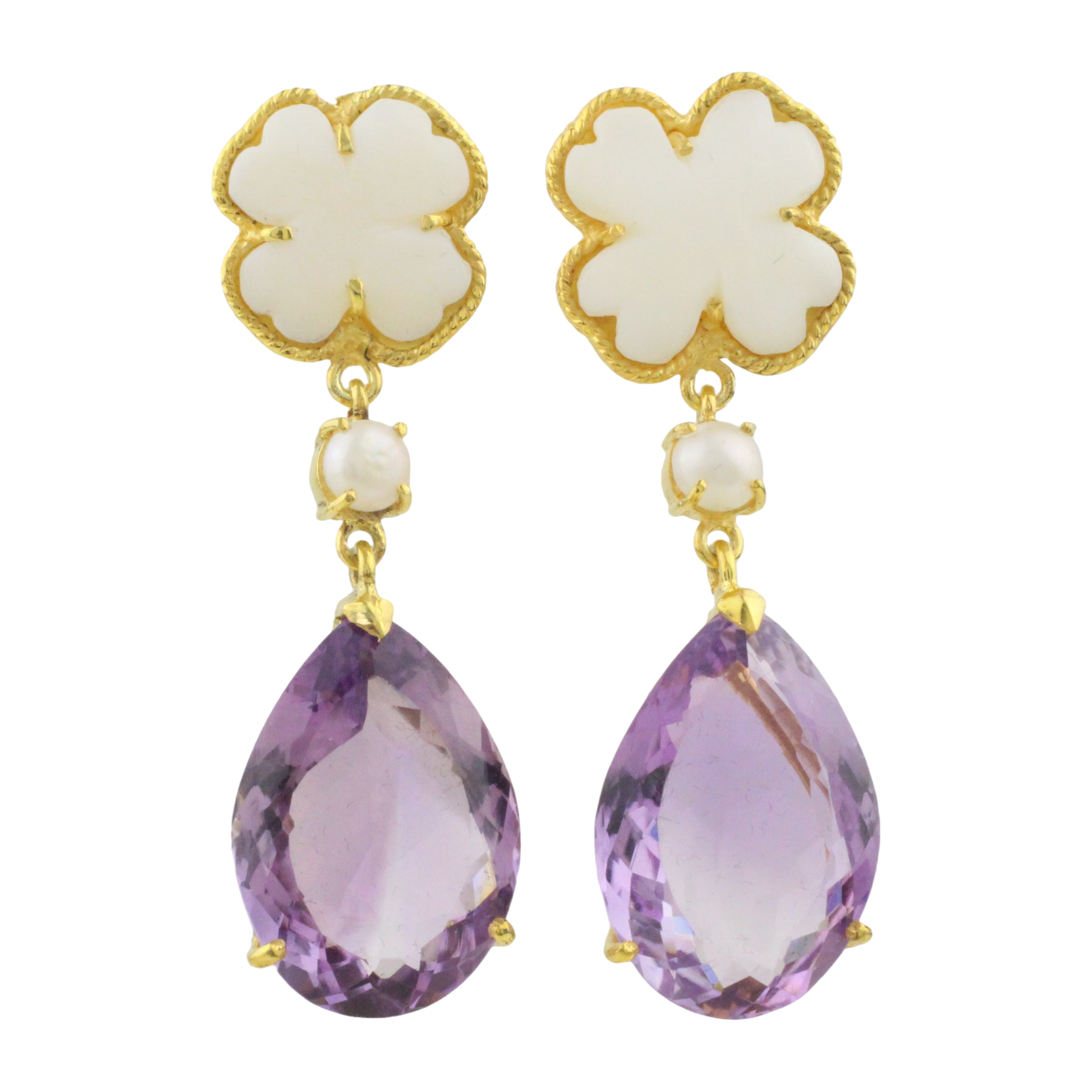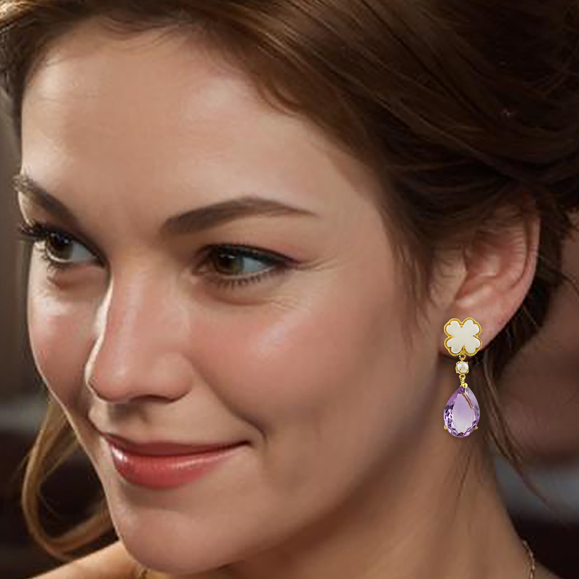 Stråla med elegans och exklusivitet i dessa handgjorda örhängen i äkta sterlingsilver (925), lyxigt förgyllda med 22 karat guld. Smyckena är utsmyckade med 14 ctv skimrande “Mother of Pearl” (pärlemor), 40 ctv naturlig ametist i fasettslipad droppform samt odlade pärlor på 1 ctw, vilket ger en vacker kombination av lyster, färg och harmoni.