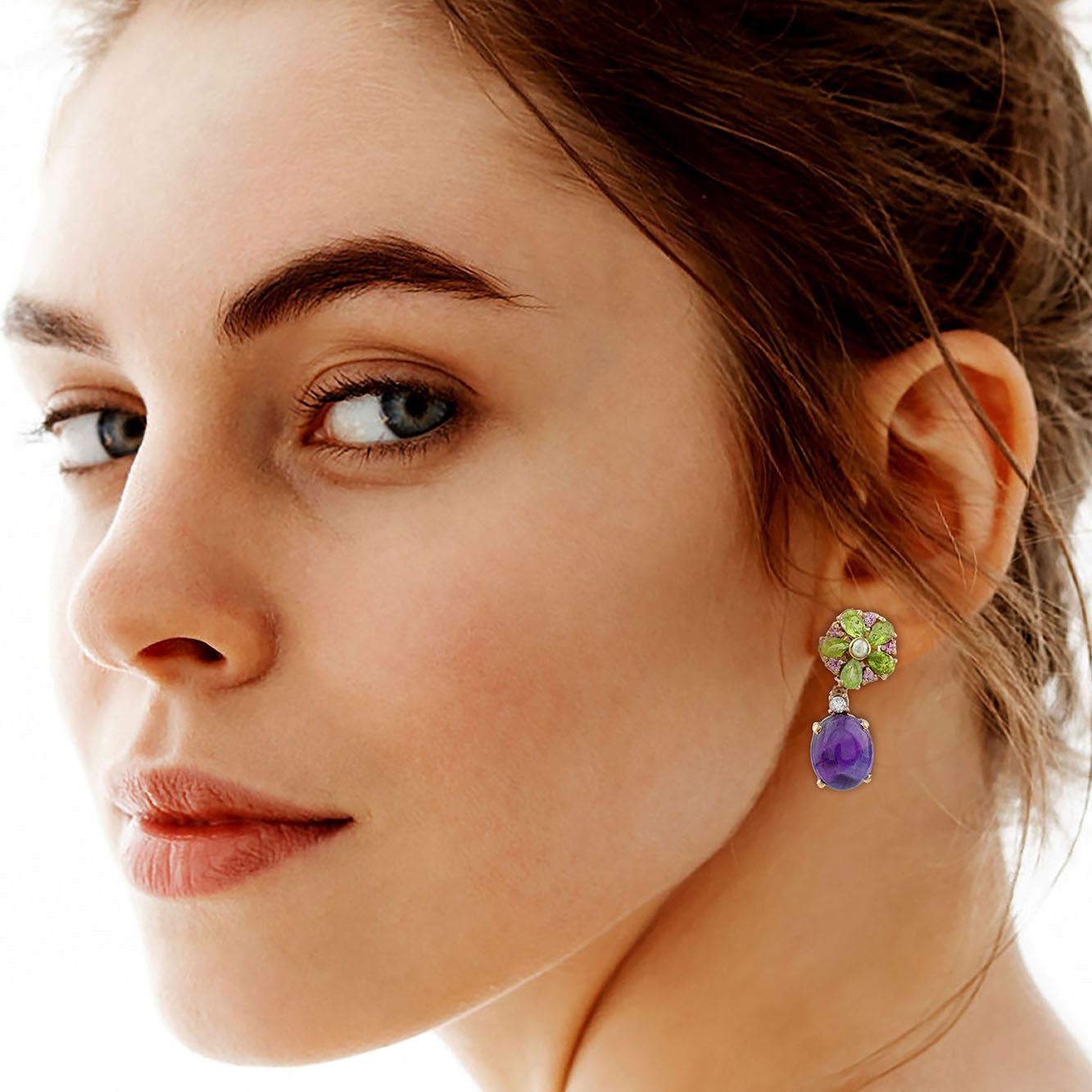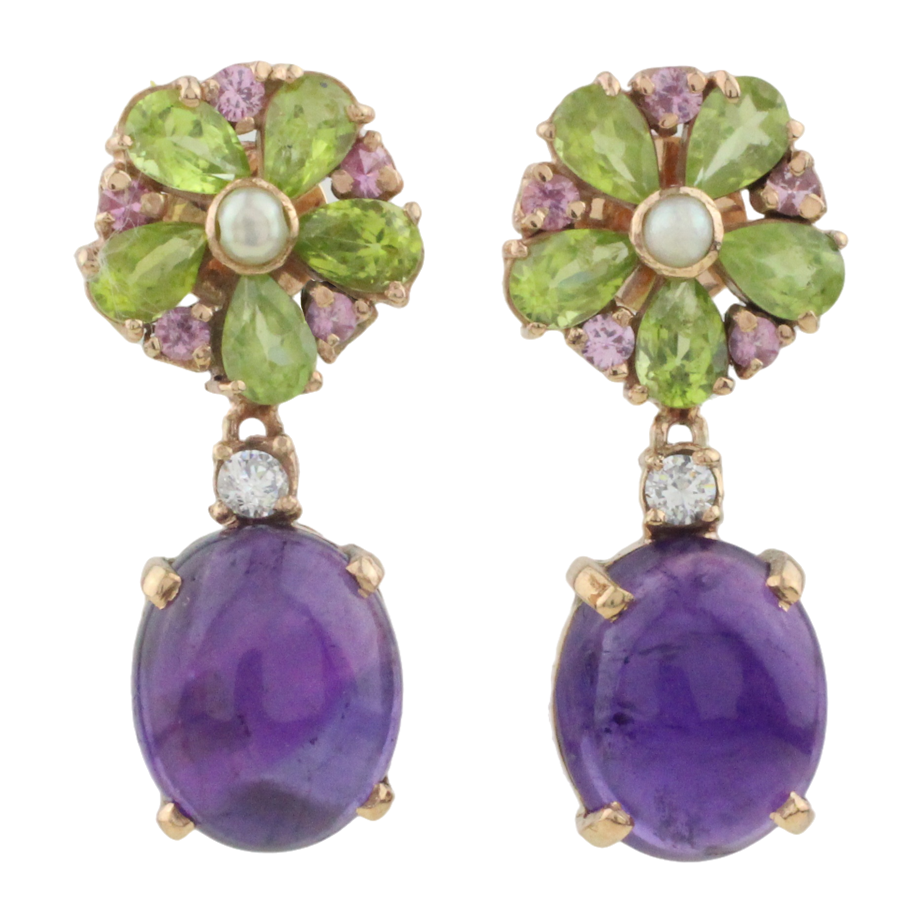 Upptäck en harmonisk blandning av färg och elegans med dessa handgjorda örhängen i äkta sterlingsilver (925), vackert förgyllda med 22 karat guld. Örhängena pryds av 6 karat naturlig cabochonslipade ametister i en djup, lila ton, 4 karat friskt grön fasettslipad peridoter och en subtil touch av 1 karat fasettslipade rosa safirer – en kombination som utstrålar feminin grace och naturlig lyx som förhöjs med pärlor och fasettslipade vita topaser.