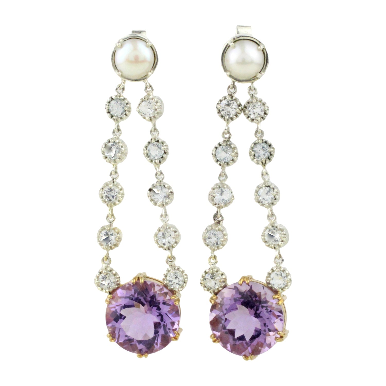 Dessa handgjorda örhängen i äkta sterlingsilver (925) med detaljer förgyllda i 22 karats guld utstrålar klassisk elegans med en modern touch. Örhängena pryds av runda fasettslipade naturliga lila ametister, som var och en hålls upp av en gnistrande krans av 10 vita topaser, och avslutas med en vackert glänsande odlad pärla – en harmonisk kombination av färg, ljus och lyster.