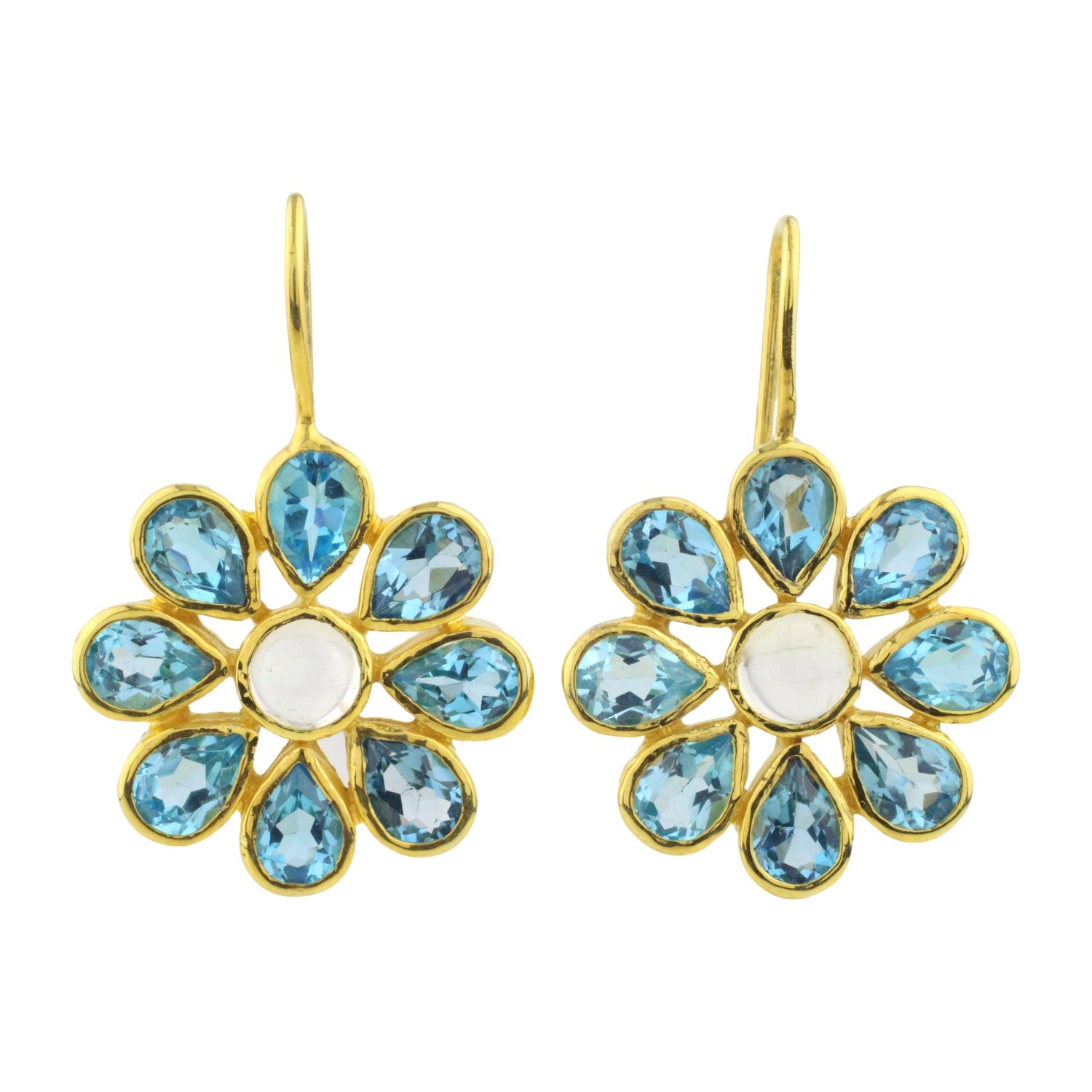 Dessa handgjorda örhängen i äkta sterlingsilver (925), vackert förgyllda med 22 karats guld, kombinerar tidlös elegans med naturlig lyster. I mitten sitter en rund cabochonslipad naturlig månsten vars mjuka skimmer fångar ljuset på ett drömlikt sätt. Runt den strålar droppformade fasettslipade Swiss Blue topaser, arrangerade i en elegant floral design som för tankarna till en blomma i full blom.