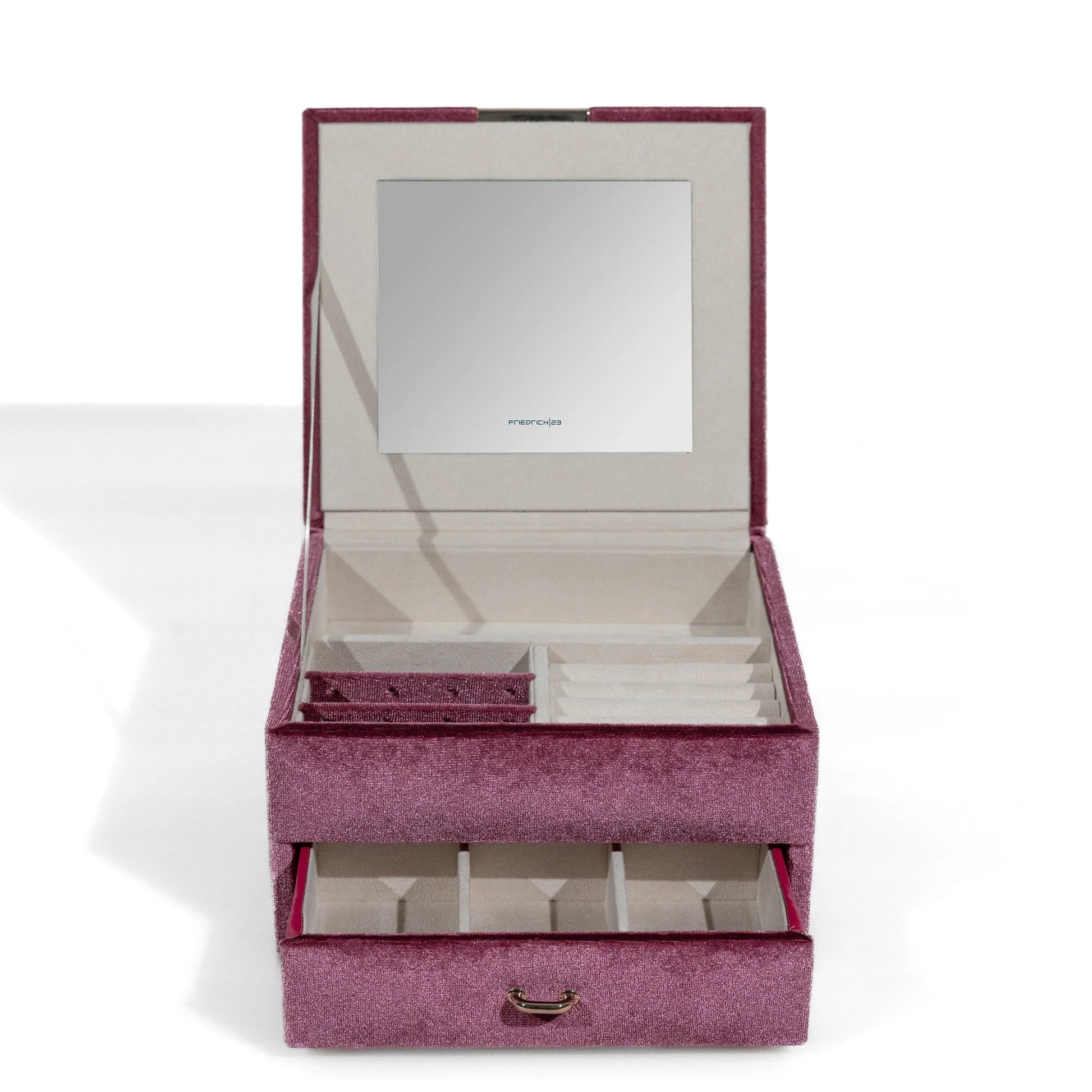 Chenille smyckeskrin är en riktig blickfångare för alla smyckesälskare. Med sitt unika yttertyg av skimrande sammetsvelour drar det genast till sig uppmärksamheten. Men det är inte bara utseendet som imponerar – även funktionaliteten övertygar. Det lilla smyckeskrinet erbjuder gott om plats för många smycken och har uttagbara hållare för örhängen som gör det enkelt att hålla ordning. Den kvadratiska designen är både stilren och elegant – ett måste för alla stilmedvetna.