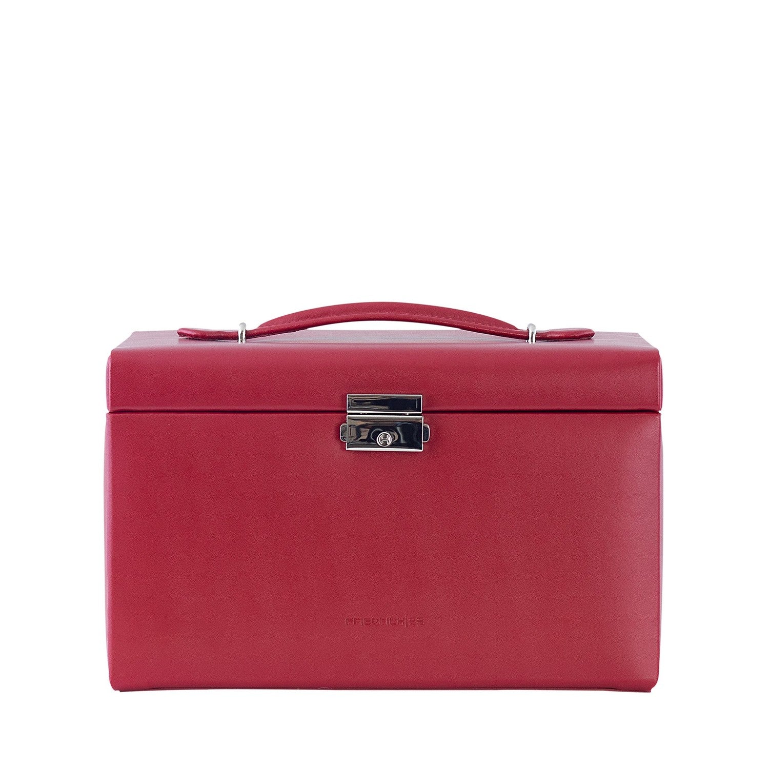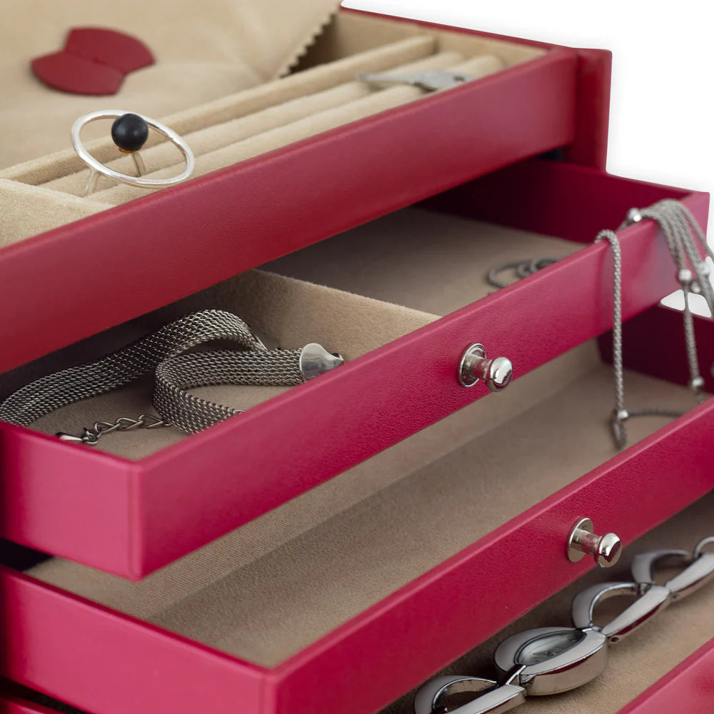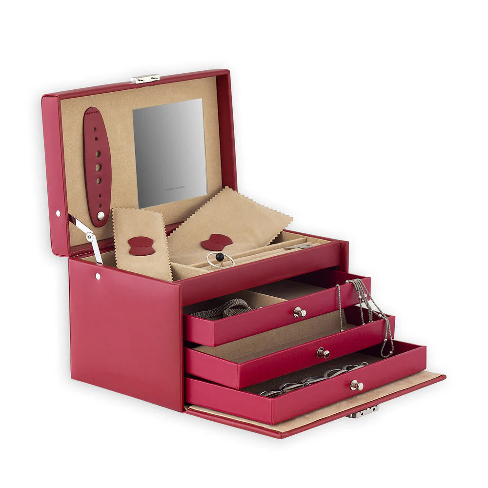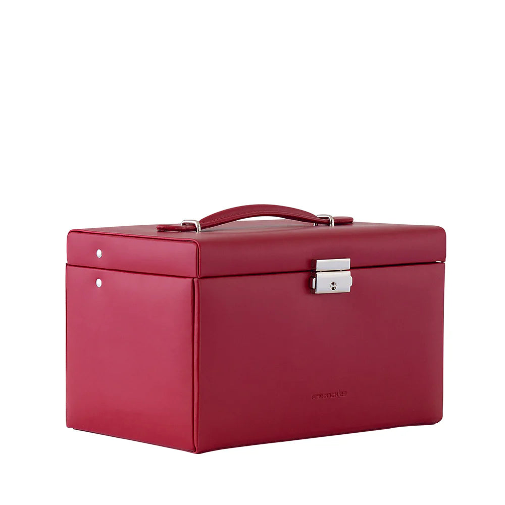 Cordoba är ett handgjort smyckeskrin, tillverkat av högkvalitativt eldigt rött läder. Den sammetslena velouren på insidan ger en mjuk och reptålig yta som skyddar ringar, armband, halsband och mycket mer. Lådorna hjälper dig att hålla ordning på dina favoritsmycken, och smyckeskrinet kan låsas för säker förvaring.